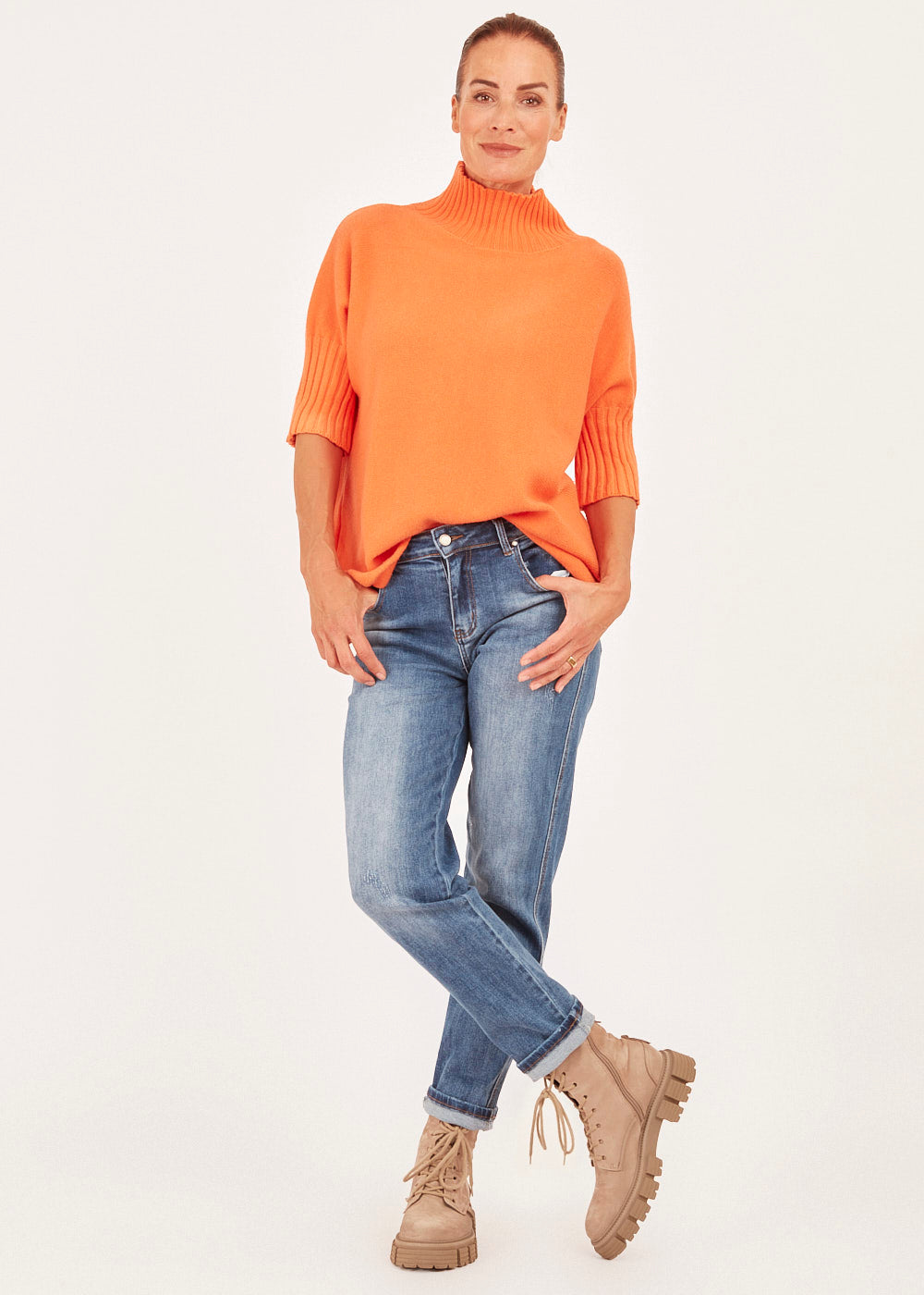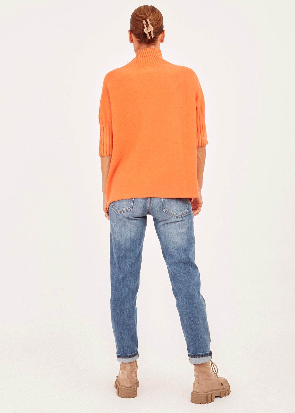 Unser Strickliebling! Kastig geschnittener Strickpullover mit Stehkragen aus unserem Viskose-Kuschelgarn. Mit Rippenbündchen am Kragen und am Ärmelnabschluss. Mit 3/4-Arm.