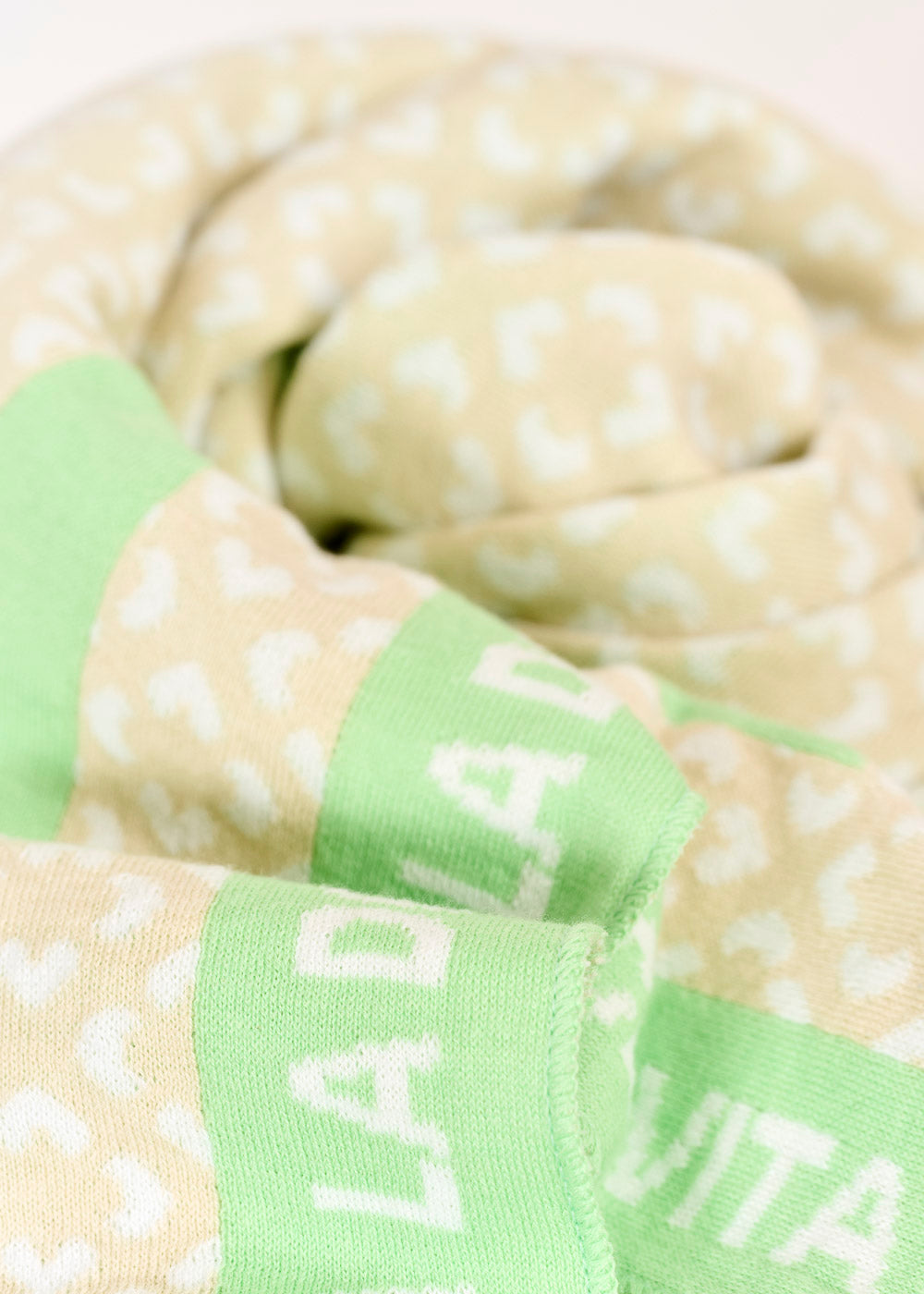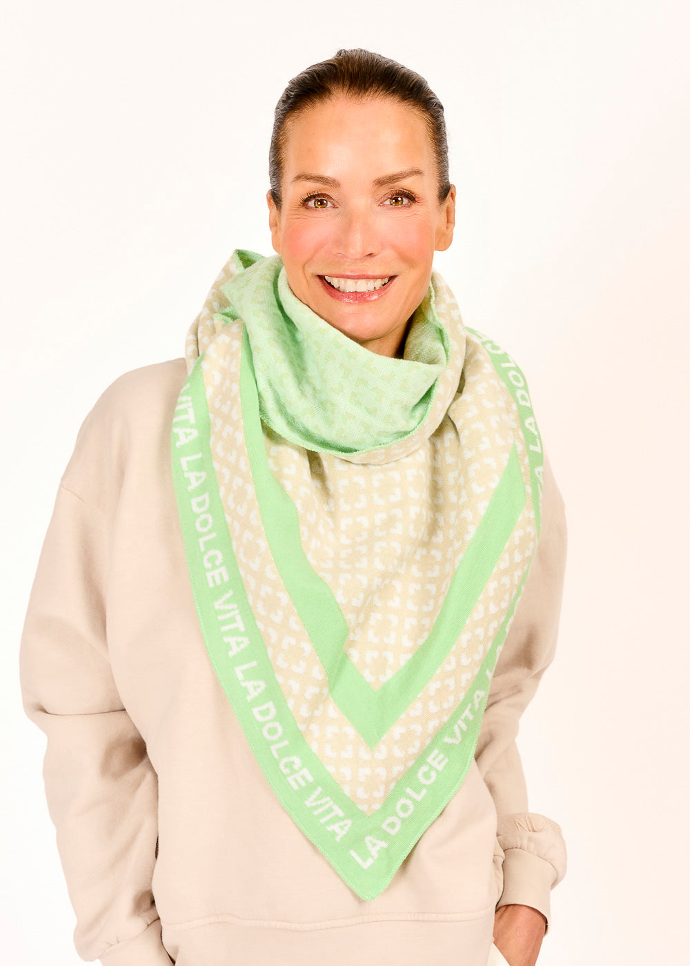 Entdecke das wunderschöne Dreieckstuch in Beige und Grün, das mit einem zarten "la dolce vita" Schriftzug (italienisch "das süße Leben") am Rand verziert ist. Dieses stilvolle Accessoire wird Dich warm halten und jedem Outfit eine besondere Note verleihen.