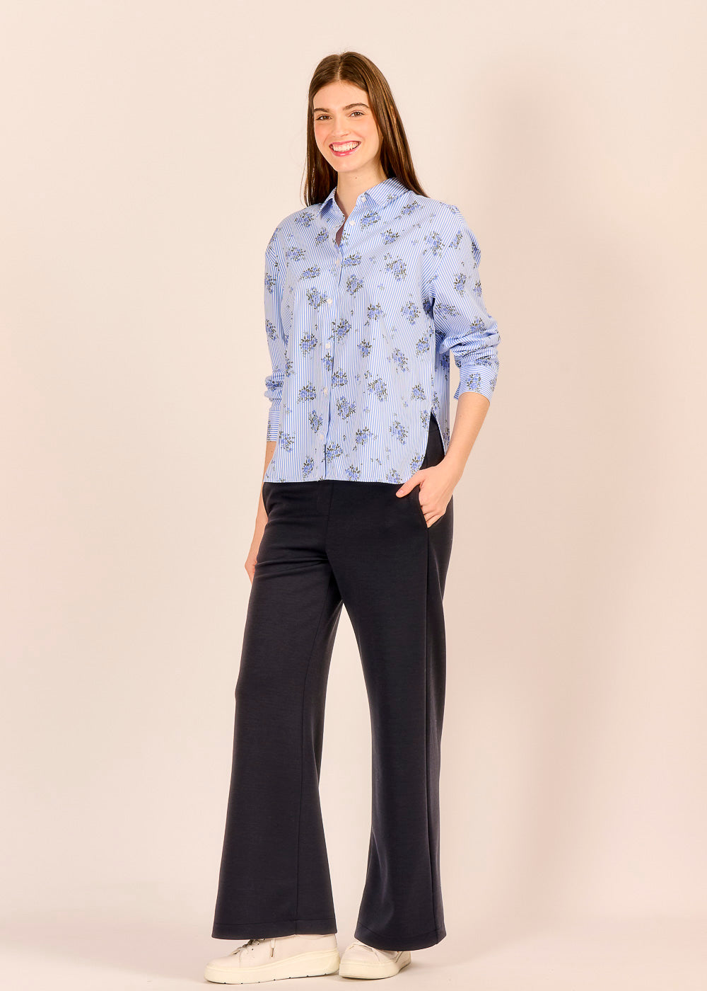 Diese Streifenbluse mit Blumenmuster vereint zeitloses Design, romantische Leichtigkeit und italienische Raffinesse, dank der Schlitze an den Seiten. Ob lässig in die dunkelblaue Hose gesteckt oder unter dem passenden Bomberino gestylt – diese Bluse ist ein echtes Lieblingsstück.